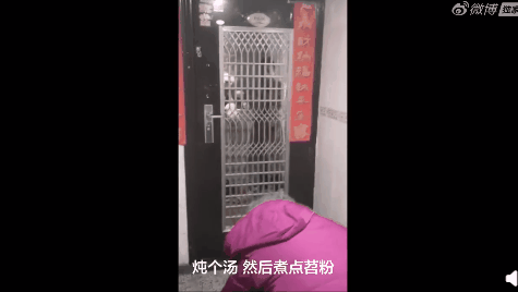 一位头发花白的老母亲提着做好的饭菜放在门口,看着门里的孩子。门里的人大声让老人走远一些。