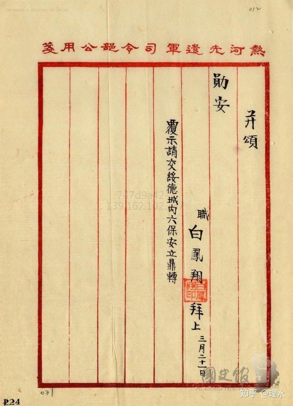 1938年3月21日,白凤翔给陈诚的信要义(共7页)。热河先遣军奉命开热河,因赴热河线路被截断改隶属晋陕绥边区司令部总司令邓宝珊。开往榆林途中,虽逗留绥德,但分化伪军工作已积极展开。伪军李守信部骑兵团长郭秀珠、步兵团团长张万兴等均表示如敌将换帜来归,协同反正。并请准将该军经费早日核定。
