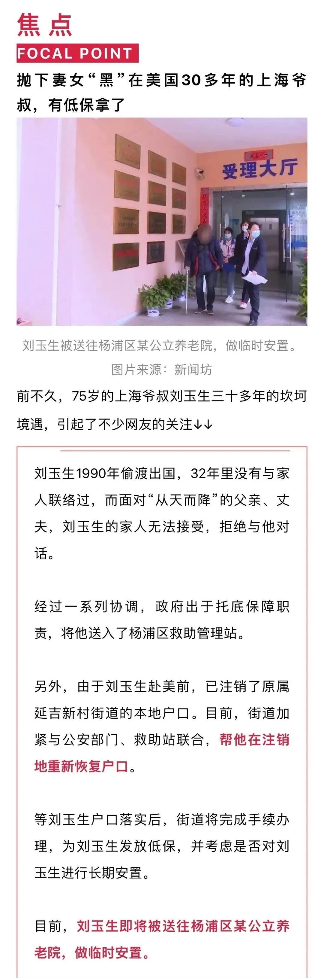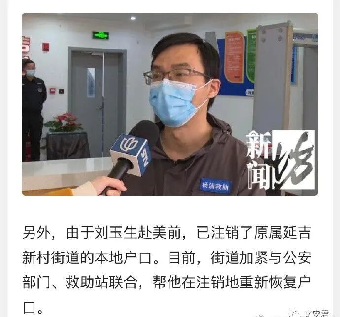 还跟他谈心,问他的诉求:你是不是想让老婆女儿养呀,是不是想回家呀?第二,也是最关键的一点,街道正在加紧与公安部门、救助站联系,帮刘大爷在原户口注销地重新恢复户口。一旦有了户口,就可以享受后续一切公民待遇和福利。第三,街道在完成落户手续后,将为刘大爷发放低保,并考虑为其进行长期安置。上海市目前的低保政策,最低一个月是1420元,最高是1850元。
